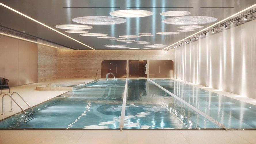 Пространство Fit Lab, которое включает 25-метровый бассейн с хот-табом, сауной и хаммамом, полноценный фитнес-зал, beauty room и зоны для йоги и воркаута во дворе. Общая площадь Fit Lab — 800 кв. м. Пространства предназначены только для жителей, которые могут посещать их бесплатно.
