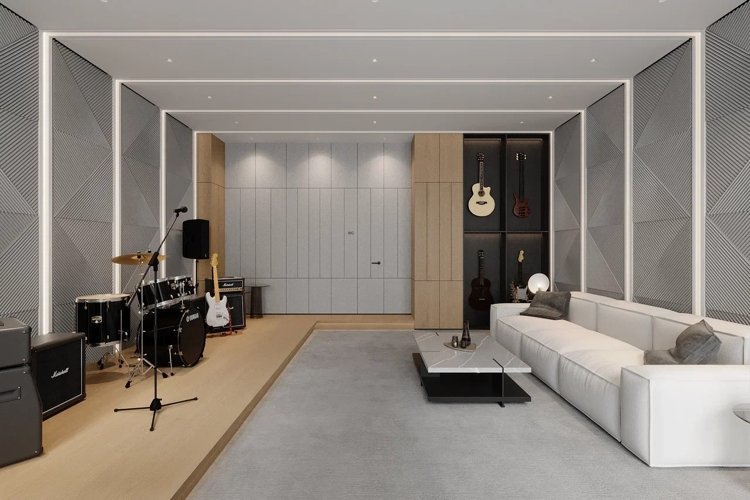 Для занятий музыкой — профессионально подготовленное и оборудованное помещение с хорошей акустикой, звукоизоляцией и огромным экраном.
